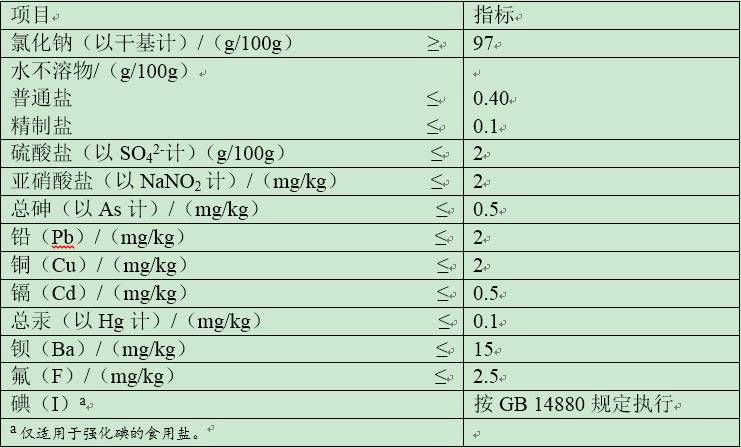 食用盐是指从海水、地下岩(矿)盐沉积物、天然卤(咸)水等获得的以氯化钠为主要成分的经过加工的食用盐,食用盐是烹饪中最常用的调味料之一,也是人体正常的生理活动不可缺的物质,由于食用盐在我们日常饮食中的重要作用,我国对食用盐的质量有严格的规定。