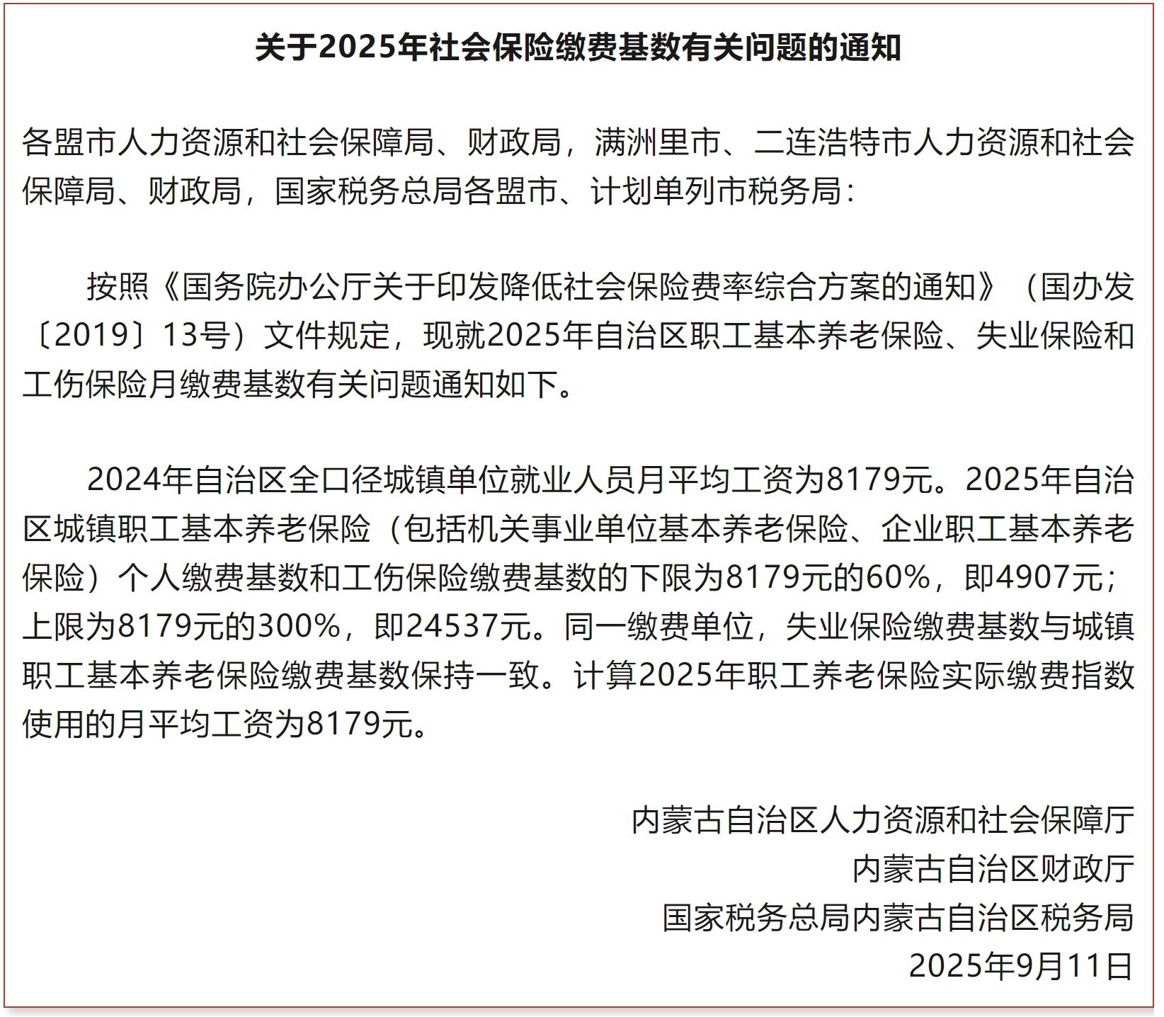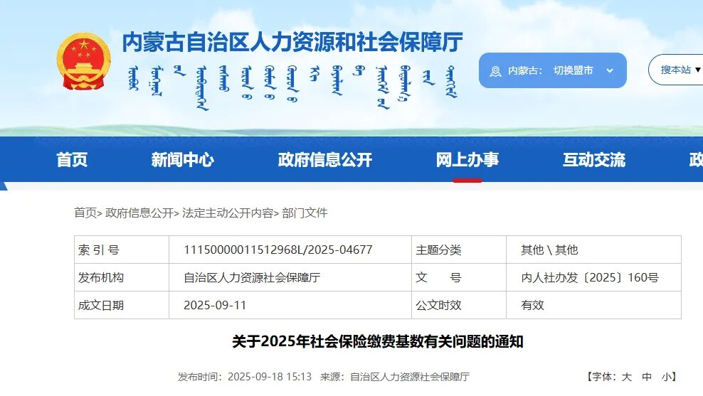 近日,内蒙古自治区人力资源和社会保障厅官网发布通知,公布2025年度社会保险缴费基数上下限标准。