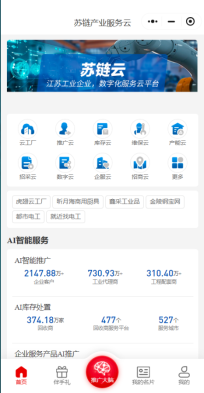 以老虎工业云和江苏省工业经济联合会主导的“苏链产业服务云”平台携手南京钢铁实现通力合作,平台聚合大量钢铁相关上下游企业,并通过平台拓展老虎工业云、江苏省工业经济联合会及其会员企业、南京钢铁及其下属服务公司的多方相关产业服务业务,通过平台聚合企业上千家,为江苏本地及周边大量工业企业实现一站式平台服务。 苏链产业服务云以创新实验室为纽带,嫁接生态资源建设虚拟产业园,构建苏链未来集群供应链,打造数字化服务平台,为企业“智改数转网联”和降本增效提供快速通道,实现业务协同增值,构建利益共同体与可持续新生态。 该平台成功入选中国工业经济联合会“2024 工业数字化转型案例”优秀案例。 苏链产业服务云小程序段界面: