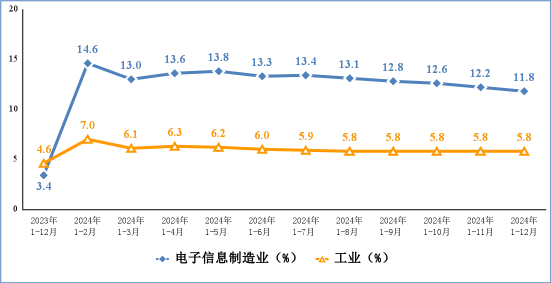 2024年,规模以上电子信息制造业增加值同比增长11.8%,增速分别比同期工业、高技术制造业高6个和2.9个百分点。12月份,规模以上电子信息制造业增加值同比增长8.7%。