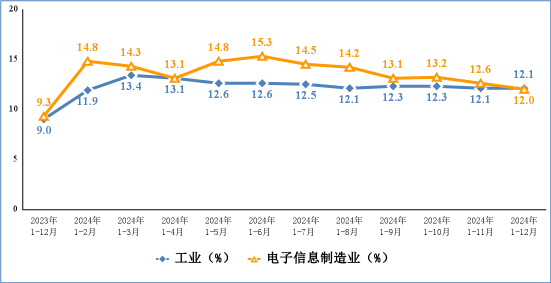 2024年,电子信息制造业固定资产投资同比增长12%,较1-11月回落0.6个百分点,比同期工业投资增速低0.1个百分点,比同期高技术制造业投资增速高5个百分点。