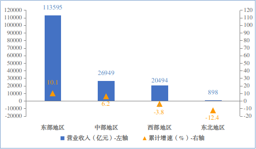 2024年,规模以上电子信息制造业东部地区实现营业收入113595亿元,同比增长10.1%,较1-11月提高0.2个百分点;中部地区实现营业收入26949亿元,同比增长6.2%,较1-11月回落0.5个百分点;西部地区实现营业收入20494亿元,同比下降3.8%,较1-11月提高0.6个百分点;东北地区实现营业收入897.8亿元,同比下降12.4%,较1-11月回升1.3个百分点。12月份,东部地区实现营业收入12536亿元,同比增长11.2%,中部地区实现营业收入2756亿元,同比增长1.5%;西部地区实现营业收入2036亿元,同比增长2%;东北地区实现营业收入99.6亿元,同比下降0.6%。